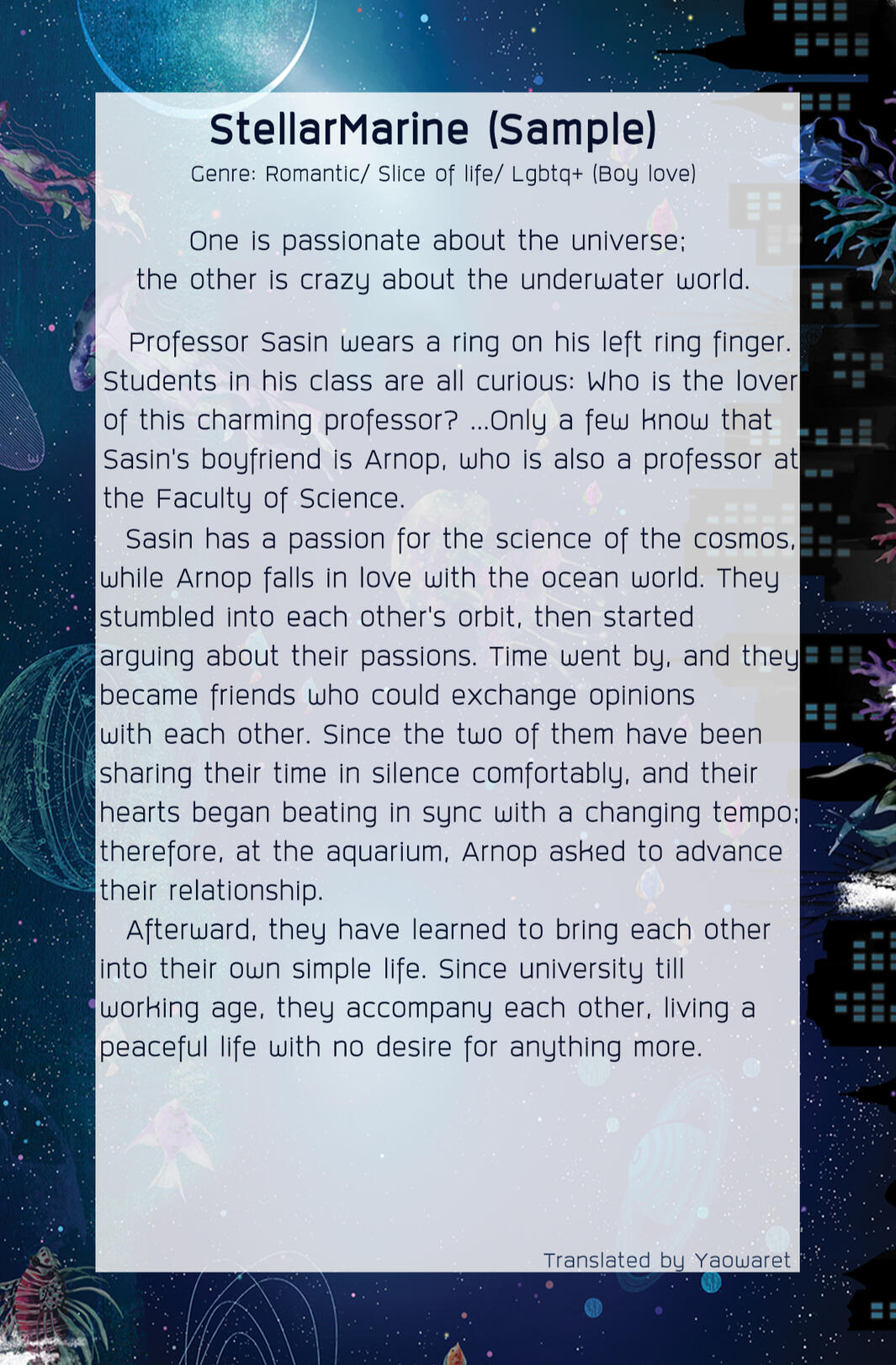 StellarMarine EN SampleTranslate by Punnachat Pradubphong and Prim TantilipikornCH.1: Sasin & ArnopIn the vast universe, countless stars were scattered all around in different sizes. Sphere planets floated in dark space, cosmic dust from asteroids drifted into stardust. Saturn’s rings, galaxies with enigmatic colors, and the great vastness of the cosmos, exquisite, beautiful, and mysterious. These images were the graphics created and put on the rectangular screen from the classroom’s projector.The classroom was dim-lit with only the projector’s light in the room to show the course material on planets and the beginning of the universe. The professor’s voice was soft and velvety, every word he let out was perspicuous. Though the class materials may not seem interesting, and the photos and video clips with audio were so lulling that they may have made one feel drowsy and dreamy, the lecture was anything but boring. Still, some students lost focus.Some doodled on their class material, some chitchatted with each other, and some others were absent-mindedly watching the lecturer instead of the lecture video. Professor Sasin’s face was one out of fine sculpture, too ethereal to belong to a man in his thirties. The raven of his hair made his face even more prominent, the high bridge of his nose, and the upturn angle made his phoenix eyes look unrelenting. His eyes were void of emotion other than doing his job of teaching what was on the course presentation. Despite the ill-lit room, the lecturer’s breathtaking face was visible through the faded light, making several students pay attention to their professor more than their class.The gorgeous professor moved the microphone closer with his graceful fingers, his shaped lips moved.“Any question?”Of course, the whole room was silent, no questions, nothing to ask about, it was a truthful reaction but not a sincere one. Everyone followed the flow of the class, no one raised or questioned anything to drag the class longer.Hence, Sasin ended today’s lecture.No one had a question about the lecture but the reflecting spark from the professor’s ring finger made many students wonder how on earth did this professor, who was so rigorous and intimidating, was taken by someone.His elegant finger was still bare last semester. But today, this man’s left fourth finger was claimed by a lovely ring, unmistakable, dazzling, and beautiful like Saturn’s rings.Our professor was married? To whom? What kind of person would his partner be? We didn't even know he was in a relationship? How was he like with his significant other, being this stern and all?Several questions were whispered among the students’ circles. Sasin was pretty popular for his looks and his legendary tough grading.He wasn’t a tough grader, it was the students who didn't meet his standards.Even so, Sasin’s face was incredibly pleasing to the eyes that many people were willing to take his class to just stare at him while he gave his long course lecture. Sometimes it was worth it even if they had to sacrifice their grade for it.Sasin was a well-known legend among many generations of students, everyone remembered his notable features from his baby face in contrast with his age, his alluring lecture voice, and his brutal exams. They all remembered that Sasin was a young, single, professor. These were what many students made notes of him, but today, they saw Sasin wearing a ring on his left fourth finger. It was truly an unfamiliar sight.College students exchanged stories, both real and fake, about the chronicles of this stunning professor, like how he spent hours grading each student’s paper from after class to nine p.m. Sasin didn’t think it was late and he wasn’t content with the work. If no one interrupted him, he probably would continued working just like that. Sasin usually ate alone, his students sometimes saw him sitting with other professors on rare occasions. But everywhere he went and everything he did, they often saw him alone.Sasin read every student's report, carefully and committedly, perhaps it was a little too committed because some students whined. Sasin had good eyes, he was attentive to almost every single small detail that even the writer of that report couldn’t see, such as an accidental double space, a single paragraph being out of organized lines, and typos. It was like he was a report-detecting robot. And if the report was plagiarized from the internet, Sasin would immediately know, of course. He wouldn't grade that report until it was rewritten by the students themselves with their very own analysis.Edit and polish the work repeatedly until the pretty professor was content with the outcome.Though Sasin taught introductory courses, the subject was extremely difficult. The seniors warned their juniors not to fall and take this class just because of the lecturer’s pretty face. But that warning might not always work because there were still plenty of students taking his course as if they were enchanted by the wicked wizard's charms not knowing that they were in danger until the midterm scores came out. That's when they realized they were in hell all along, not in some paradise.There were so many rumors about Sasin that one could say he was the faculty’s highlight.Sasin was a determined lecturer since the first year he became a professor. This year, since the semester started, he continued to fulfill his duty until it was past midterm towards the end of the semester. Nothing changed except a silver ring that suddenly made an appearance on his finger. Not that it was strange for someone like Sasin to have a life partner, the man was incredibly good-looking, it wouldn't be surprising if he were to find a significant other. But one time, a word got out from a professor in the same faculty.That Professor Sasin’s partner was a fellow professor.That created a soft commotion because no one ever saw Professor Sasin being particularly close to any professor